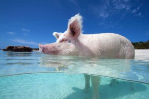 A white pig swimming in the clear blue waters of Staniel Cay in The Bahamas. 1. Swim with the Famous Pigs at Big Major Cay