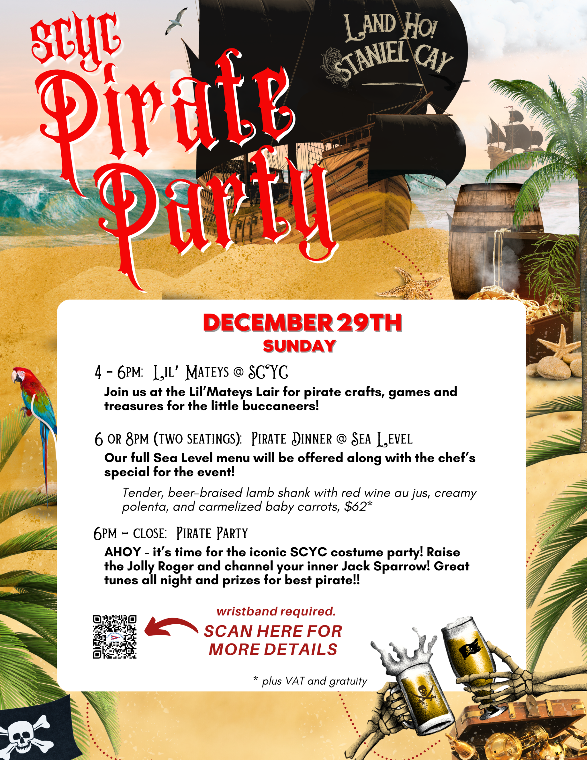 WRISTBAND PRICING AND POLICIES: Pirate Party: $15 entry fee wristbands available at the Marina Office. Registered marina guests, $10/wristband. Registered hotel guests and Sea Level dining guests, complimentary. Kids under 10 free. A responsible adult must accompany all minors (under 18). Costumes highly encouraged. Please scan QR code below for information.